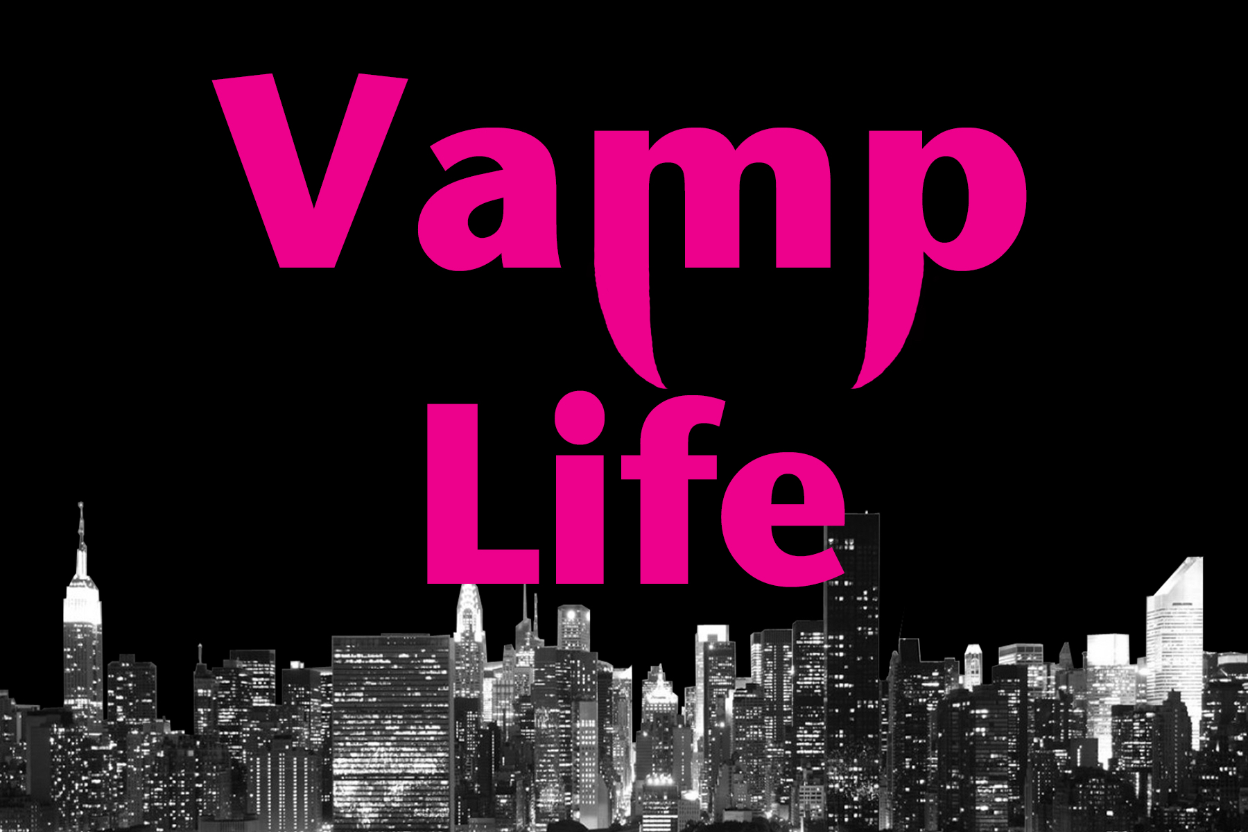 A title card for a show I am writing about modern day vampires. The show takes place in New York city and the main characters are very feminine. The pink font and letters represent the new age characters against a classic old school black and white photograph.